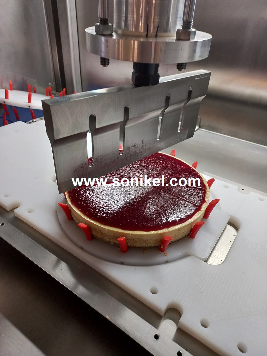 Sonikel Ultrasonics, designs and manufactures Ultrasonic cake slicing Machine for food industry. In cake industry, especially frozen cakes and pastry are difficult to cut and slice with the same dimension and smoothly. Ultrasonic cake slicers can cut minus12’C frozen cakes like cheesecake or other types of cakes including cream or fruits.